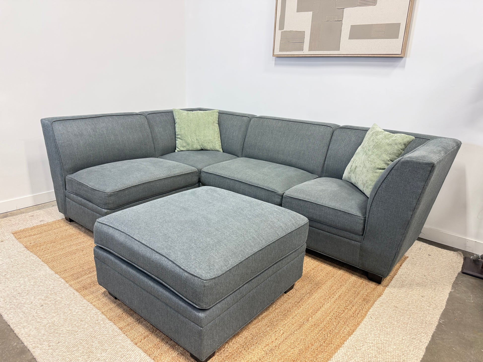 This versatile modular sectional has been professionally cleaned before selling. It’s in great condition with no structural issues. Light wear on the ottoman .