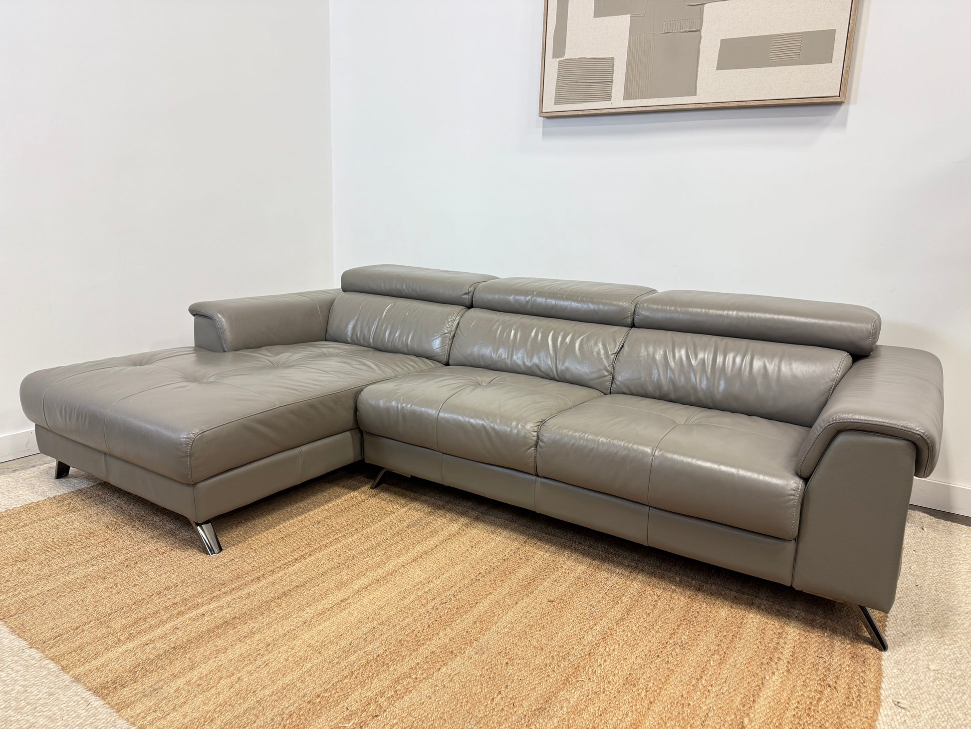 Modern and stylish sectional in top-grain leather, fully cleaned and conditioned before selling. Features adjustable headrests and sleek chrome legs for a contemporary look.