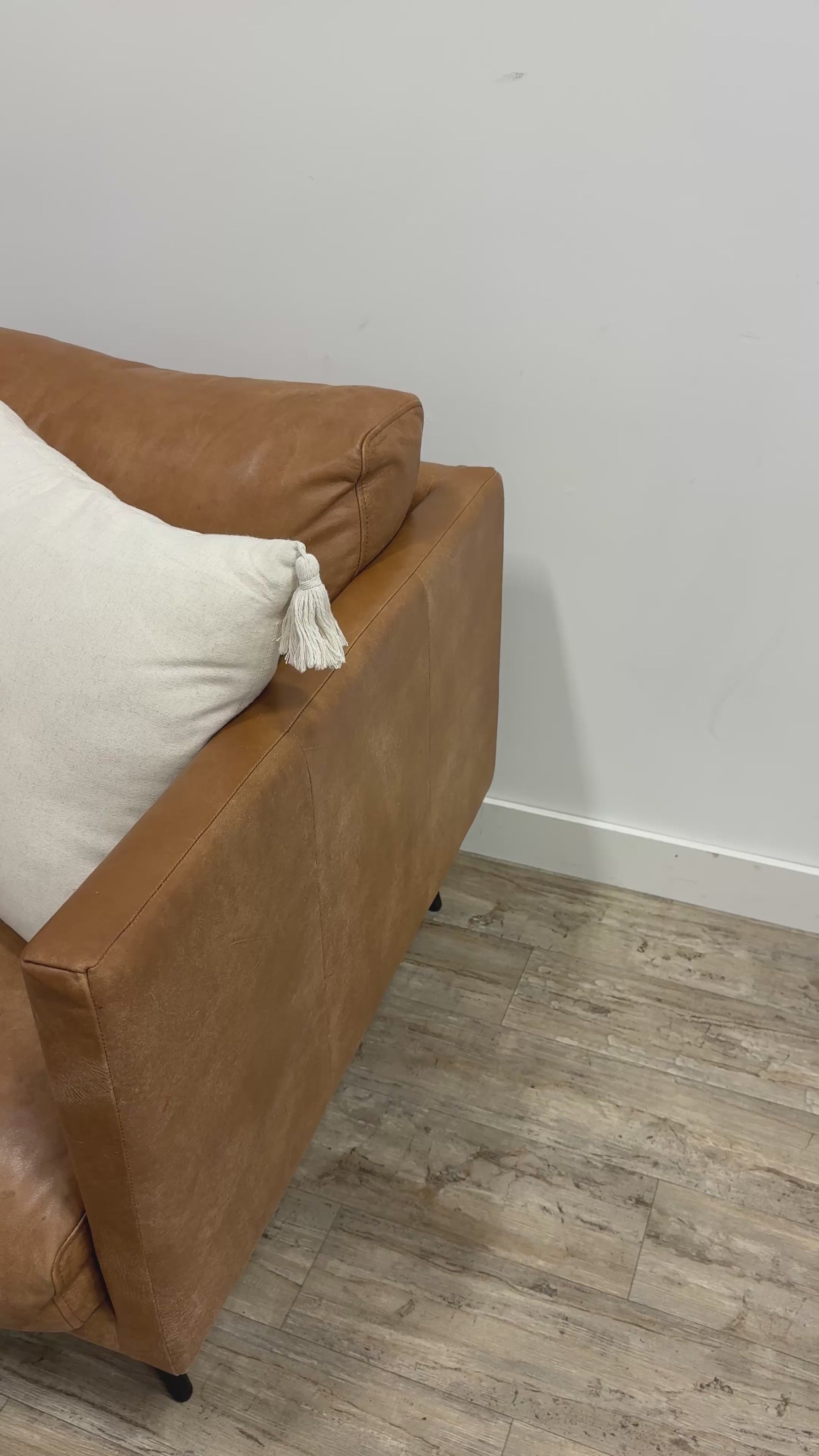Relaxed, vintage-inspired comfort meets high-quality craftsmanship. This pre-owned Article Nirvana sofa is upholstered in full-aniline Dakota Tan leather — a premium leather that develops a rich, natural patina over time. The soft seats create a cozy, lounge-worthy feel that pairs beautifully with boho, mid-century modern, or warm minimalist interiors.