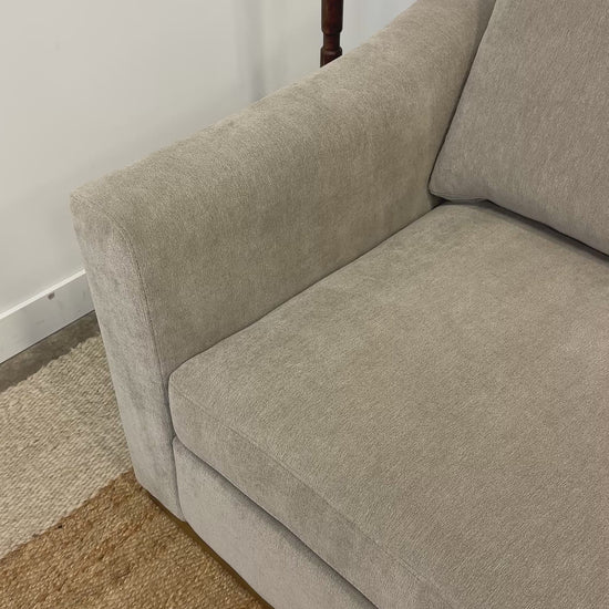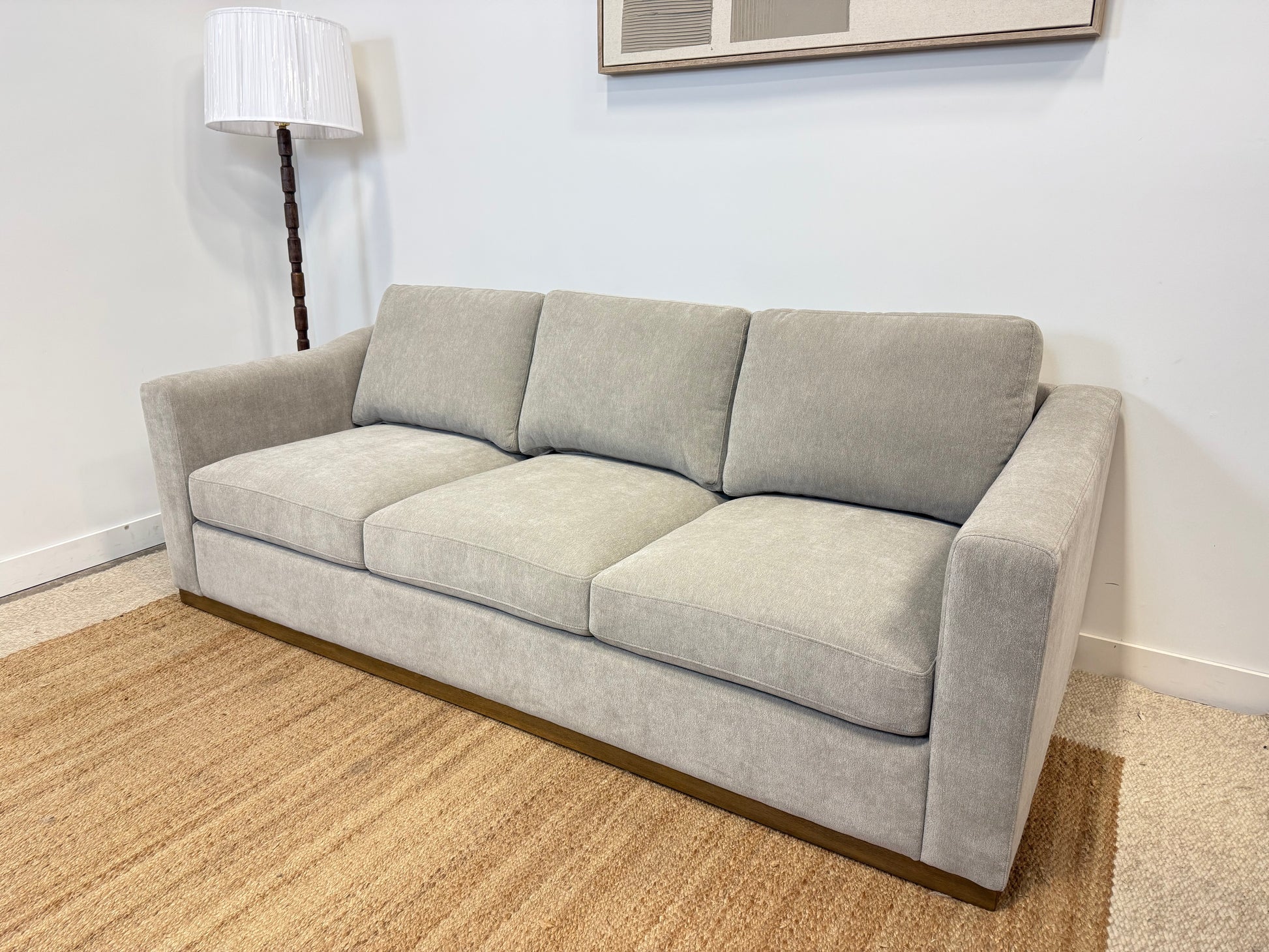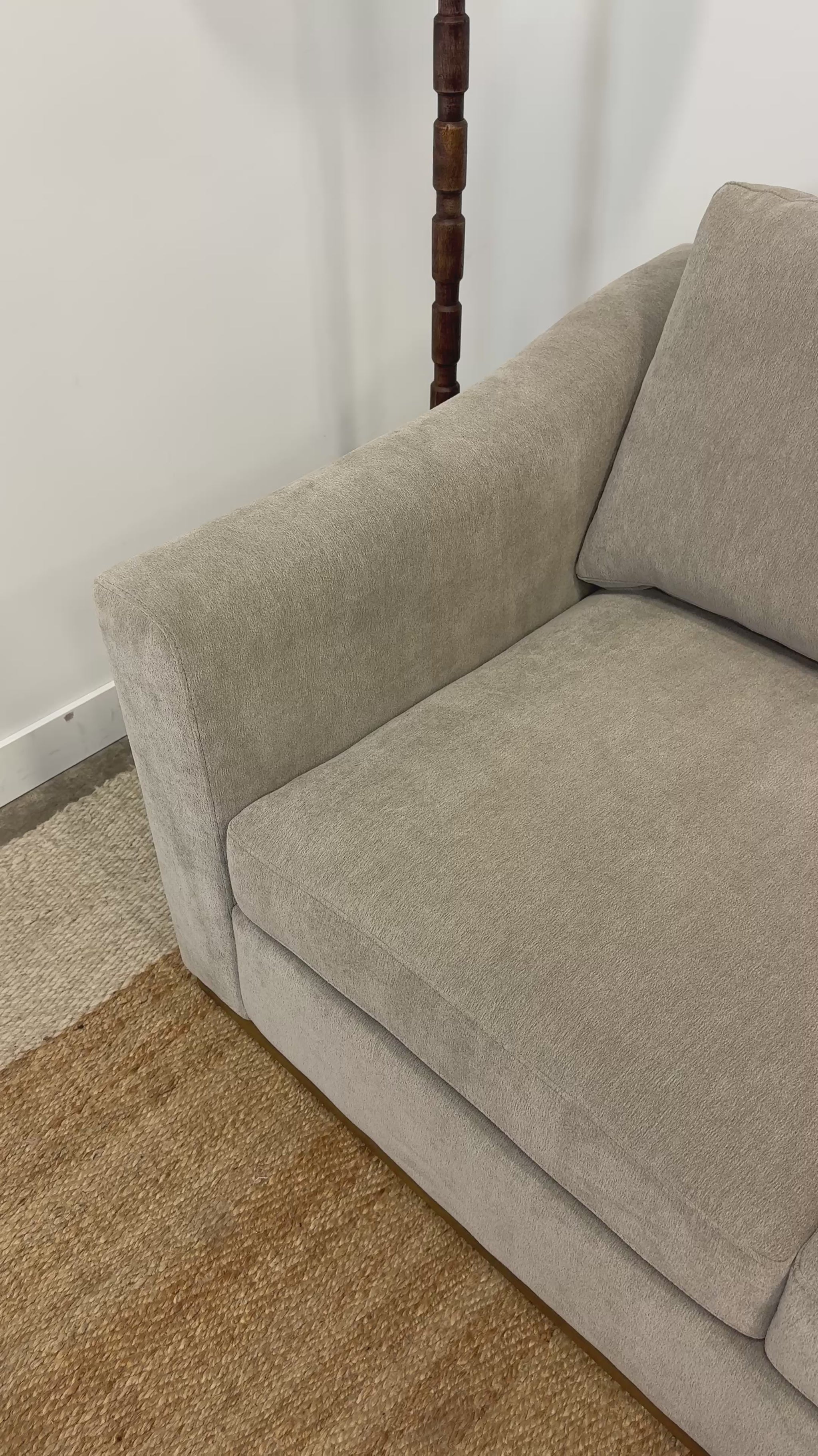 Beautiful, modern 3-seater sofa in a soft taupe fabric with a smooth, minimalist look. Features a solid rubberwood trim base that adds warmth and style. Comfortable pocket-coil seating and durable sinuous spring suspension provide long-lasting support. Back cushions are reversible for easy refreshing, while seat cushions are attached for a clean, tailored finish.