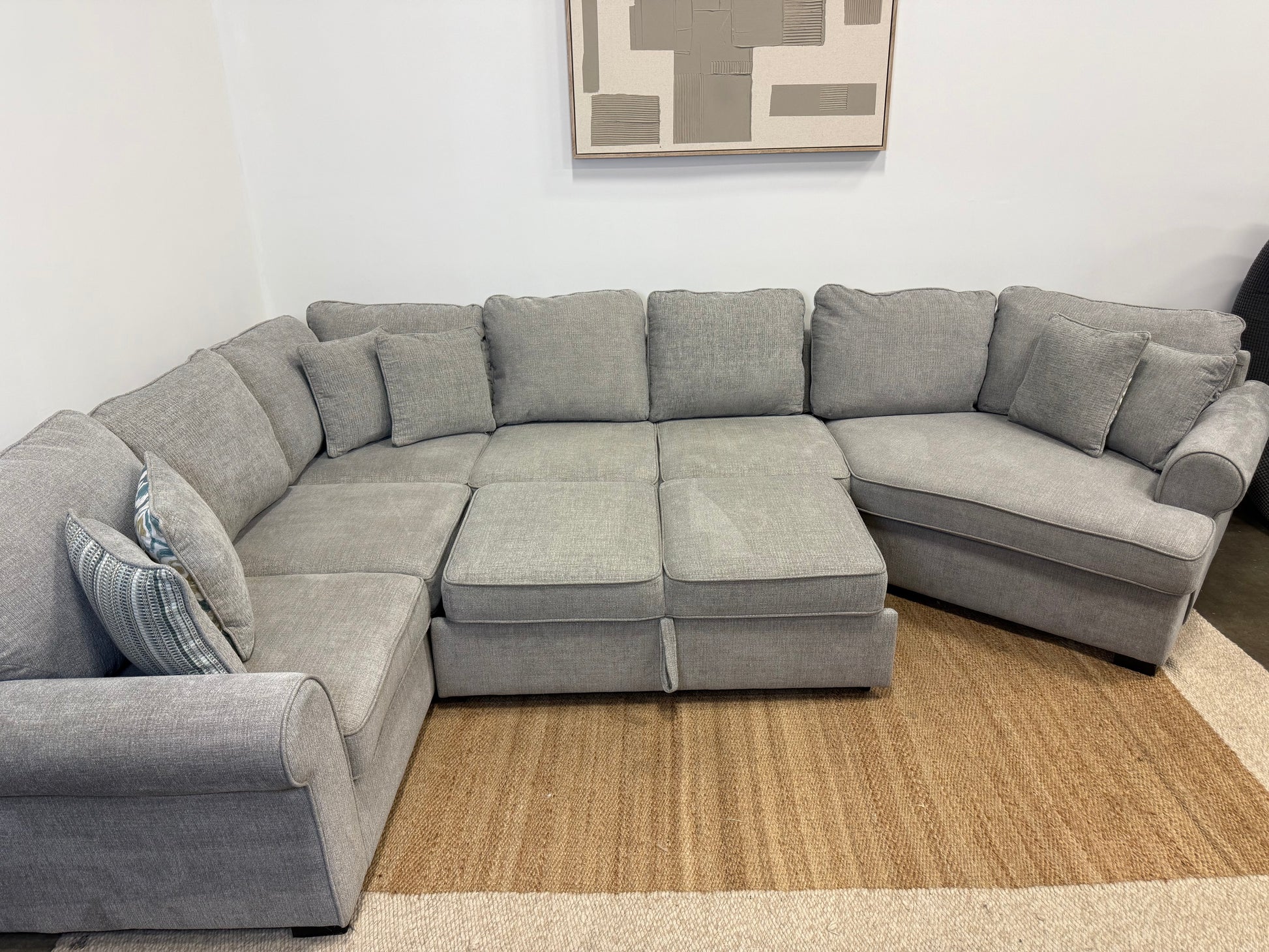 beautiful pre-owned sectional is professionally cleaned and in great condition. Its ultra-cozy, spacious design makes it perfect for a large family or entertainment space.The sectional separates into three pieces for easy moving and includes a cuddle corner plus a pull-out section that converts into a sleeper — ideal for guests or movie nights. Back cushions feature removable, washable covers for effortless maintenance. Small tear on the seam that was sewn. Comes from a non-smoking, pet-friendly home.