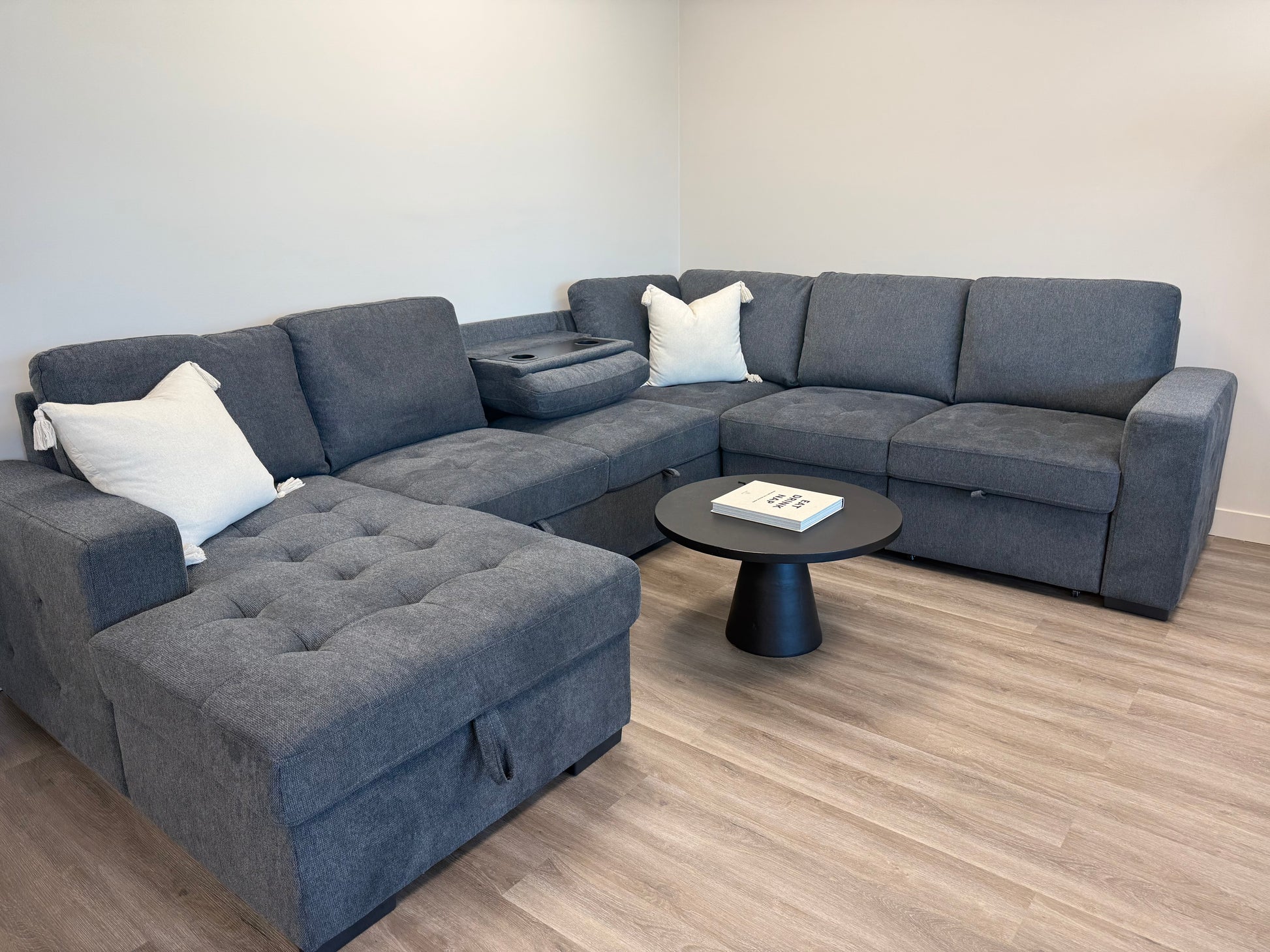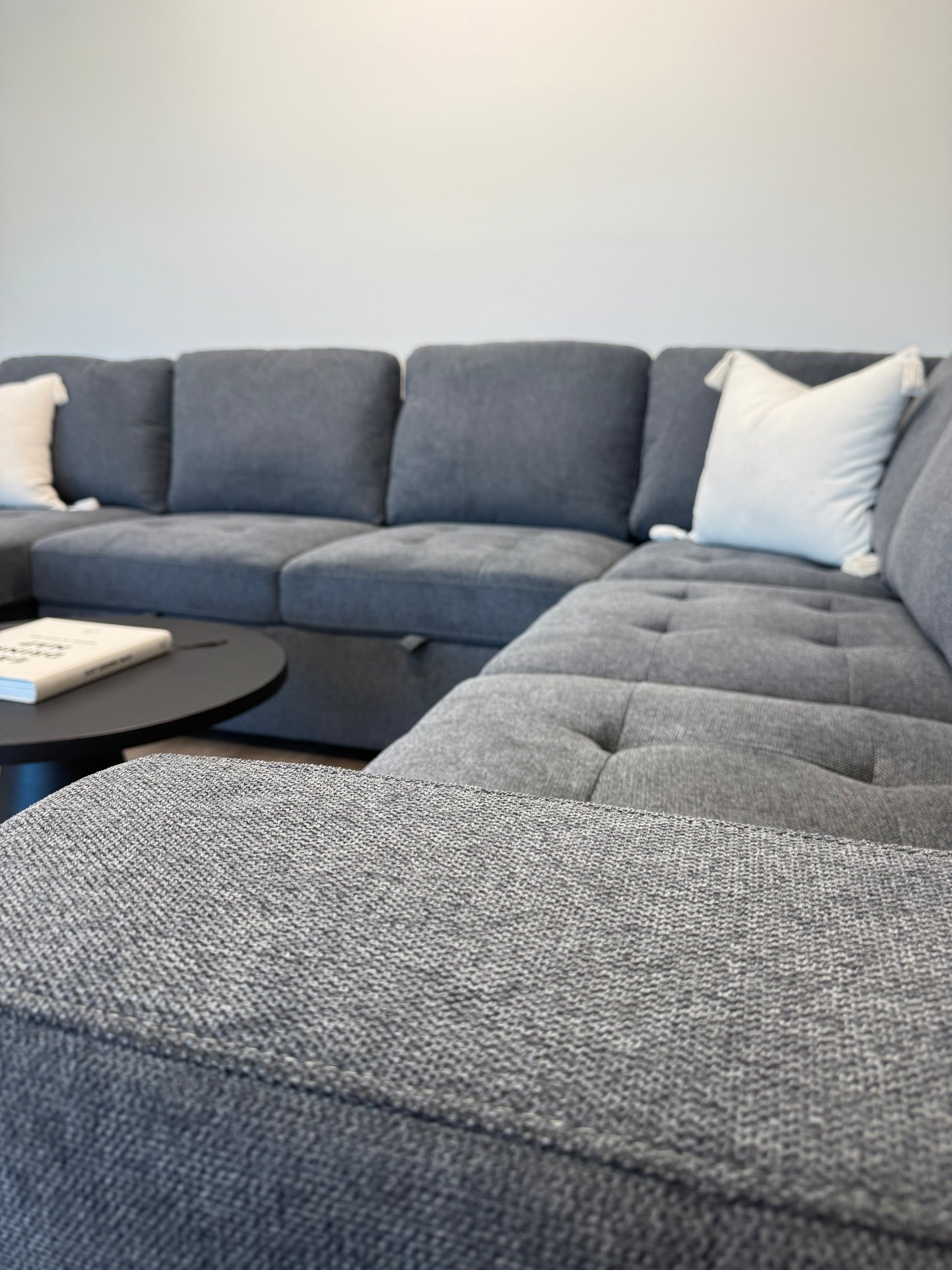 Experience the perfect blend of comfort and functionality with the Victoria Sectional — our newest model designed for modern living. With two pull-out extensions, a convenient drop-down console, and Storage space , this sectional is made for both lounging and practicality.